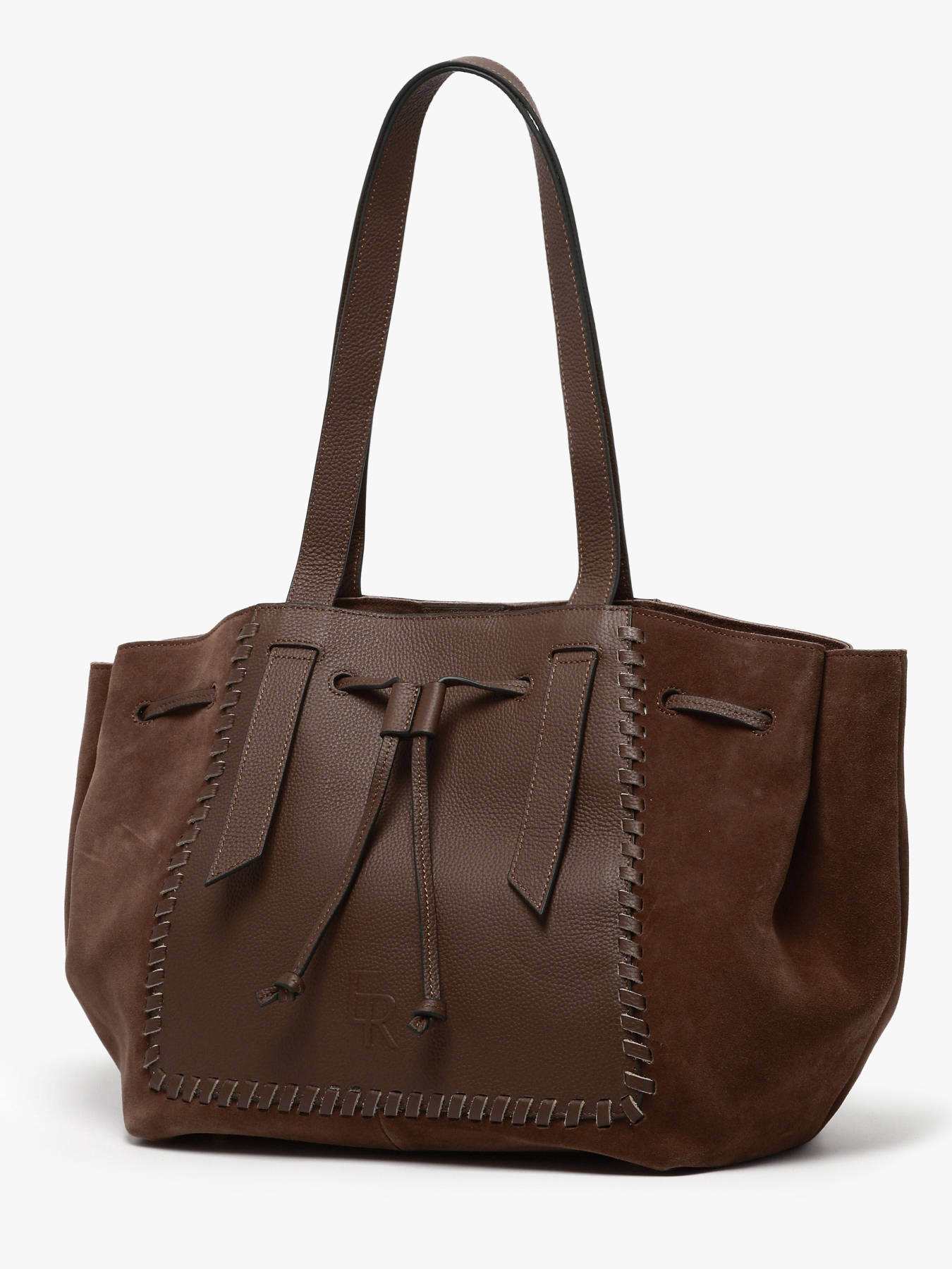 De schoudertas uit de BRUMBY-lijn van ETRIER is een shopper in bi-materiaal van glad leer en suède, verfraaid met een elegant vlechtwerk geïnspireerd op de iconische stijl van het huis. Dit royale model in A4-formaat biedt moeiteloos plaats aan een 13-inch laptop, terwijl het zijn verfijnde uitstraling behoudt. Een grote, uitneembare katoenen binnentas met ritssluiting beschermt uw spullen en biedt efficiënte opbergruimte dankzij een open vak en een ritsvak. De tas wordt comfortabel over de schouder gedragen en combineert stevigheid met verfijning in de gevlochten details.