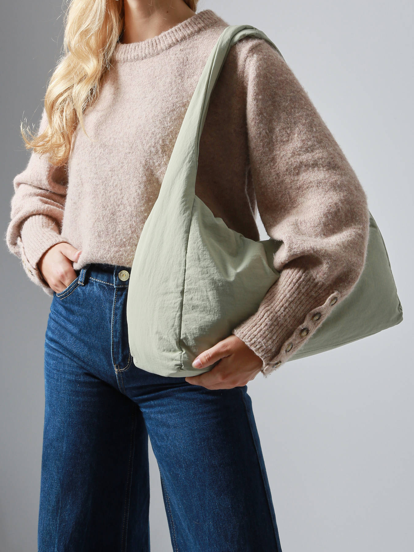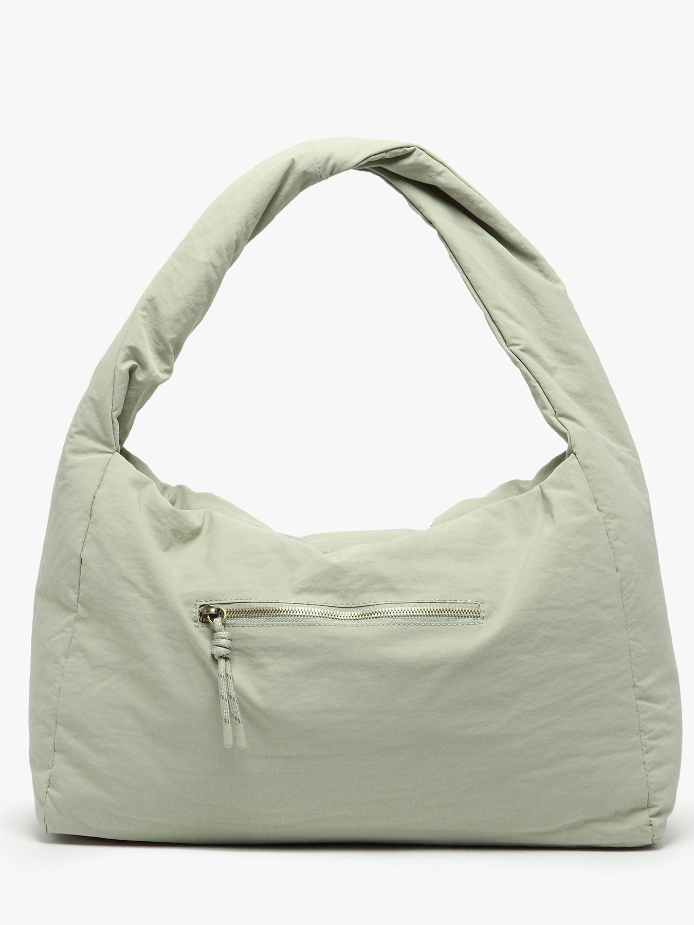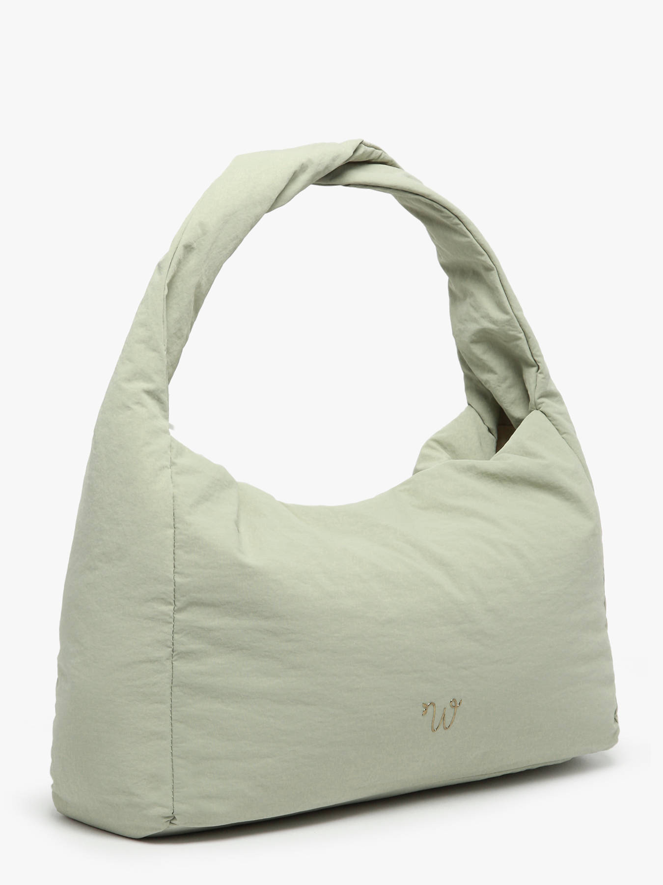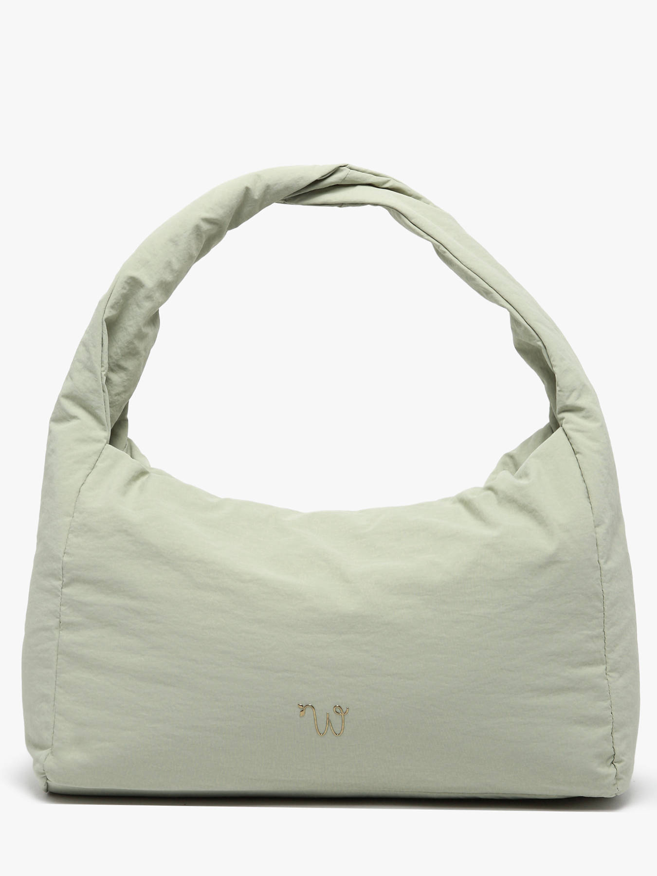 De WOOMEN schoudertas uit de PRIMEVERE-lijn, praktisch van groot formaat, valt op door zijn elegante gedraaide hengsel, sierkoordjes en het gouden W-logo van hars. Gemaakt van gerecycled nylon, beschikt hij over een ritssluiting, een achtervak en een binnenkant gevoerd met katoen en linnen met twee eenvoudige vakken, een ritsvak en een hoofdvak.